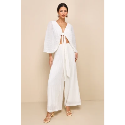 Pristine Presence Ivory Plisse High-Waisted Wide-Leg Pants